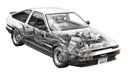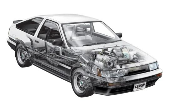 AE86代指的是丰田第五代卡罗拉(参数|询价)家族的衍生双门跑车,根据外观车灯的细节区别,又分为LEVIN和TRUENO两个车型。无论LEVIN还是TRUENO,它们都采用了前置后驱布局,代号为4A-GE的4缸1.6升自然吸气发动机的输出为130马力,推动仅940公斤的车身,相当轻松。由于其使用了在当时都显得十分老旧的后硬轴非独立式悬架结构,所以AE86在行驶时拥有相当活跃的车尾动态表现,也就是说,开着它漂移,很简单。