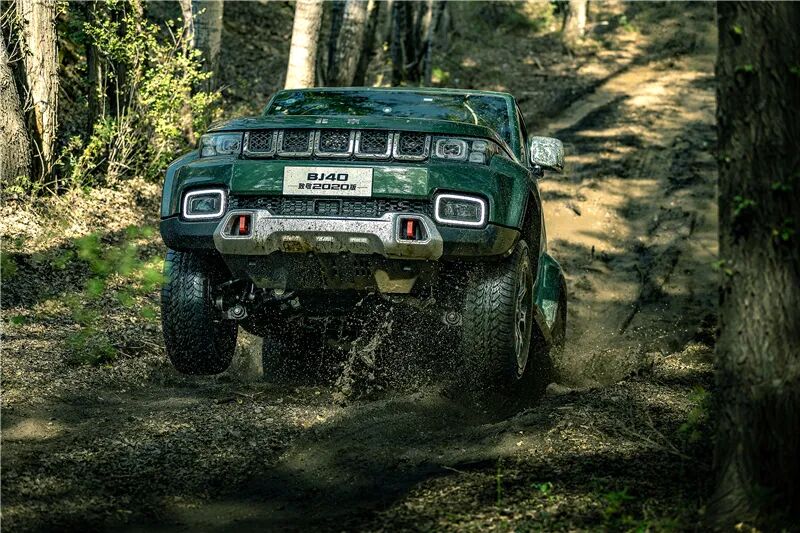 BJ40致敬2020版是中国硬派越野车中唯一一款采用短轴双门造型的车型,整车造型采用BJ40家族基因进行设计,方正硬朗的设计风格,前脸经典的五孔式进气格栅搭配方形头灯组,气势十足。此外,银色前护板搭配红色的拖车钩,非常有“野性”,同时也使整个车头更具视觉冲击力。车身颜色方面,新车提供极夜黑、雪域白、火焰红、丛林绿、深海蓝5个系列漆色套装供消费者选择。