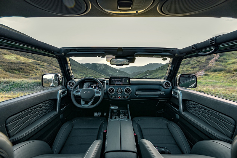 内饰方面,新车沿用了BJ40家族式的设计风格,大面积软包材质、蓝色立体装饰面板、彩色氛围灯等,使整个内饰看起来更具质感。而12.3英寸全液晶仪表和10英寸中控屏、多功能运动方向盘以及电子档杆的加入,进一步提升了整车的科技氛围。