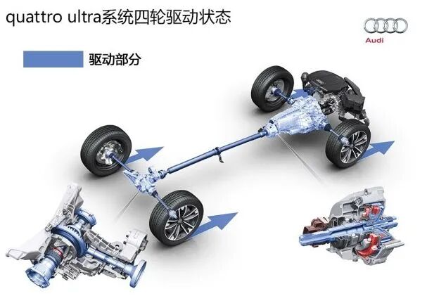 虽然奥迪现在不少车型依旧会在尾部贴上quattro的LOGO,不过在中低端车型上大都已改用QuattroUltra智能四驱系统。与quattro全时四轮驱动系统相比在油耗方面有更优秀的表现,通过电控离合器和电子限滑也可以满足大多数的路况,只不过电子控制也是需要反应时间。