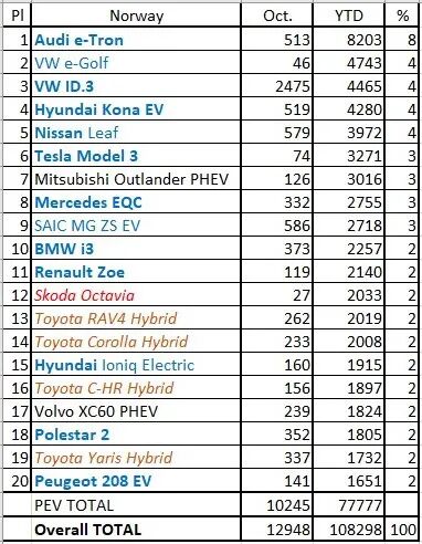10月挪威市场,插电式汽车份额达79.1%