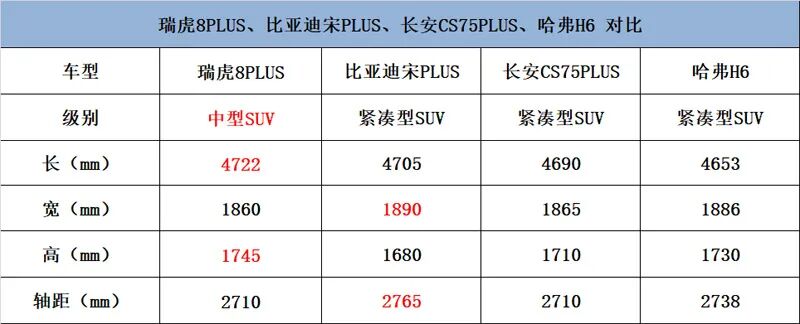 首先在车身尺寸上,瑞虎 8 PLUS 和瑞虎8(参数|询价)相比较,并不具备“PLUS”的理念,瑞虎8 PLUS长宽高分别为4722mm、1860mm、1745mm,轴距2710mm;相比现款瑞虎8的4700mm、1860mm、1746mm和2710mm,其最大变化是车身长度增加22mm,这是因保险杠造型变化所致,对车内空间没有影响。两款车在轴距,宽度以及高度基本上一模一样,难道只要增加了车身长度,就可以称之为是“PLUS”版本了?其次就是奇瑞厂家把瑞虎8定位为中型SUV,但是它的车身尺寸仅仅是与紧凑SUV相当,相比紧凑级SUV第三代哈弗H6(参数|询价)的轴距2738mm和比亚迪宋PLUS的2765mm分别减少了28mm和55mm,仅与紧凑级SUV长安CS75plus相同。可以说作为一款中型SUV车型,瑞虎8PLUS在空间并没有紧凑级SUV的哈弗H6和比亚迪宋PLUS大。