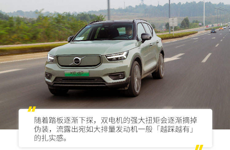 此前曾有人说,特斯拉的加速锐利、线性,带来犀利的感官刺激的同时,也让人精神紧张。虽然XC40 RECHARGE的百公里加速时间只有4.9秒,但在你踩下加速踏板时,却丝毫感受不到神经质一般的扭矩响应,只会让车辆呈现出积极、迅捷的加速表现,亲和力极强;随着踏板的逐渐下探,双电机的强大扭矩会逐渐摘掉伪装,流露出宛如大排量发动机一般「越踩越有」的扎实感;在最后的一小段踏板行程,XC40 RECHARGE会彻底显露出电动车的「疯狂」本质,即便做好心理准备,照样不影响它给你带来强烈的加速刺激。
