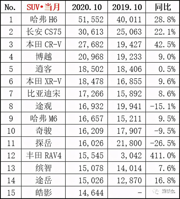 SUV领头羊自然还是哈弗H6(参数|询价),第二名长安CS75(参数|询价)也跻身月销3万辆的行列,二者为自主品牌争光不少。