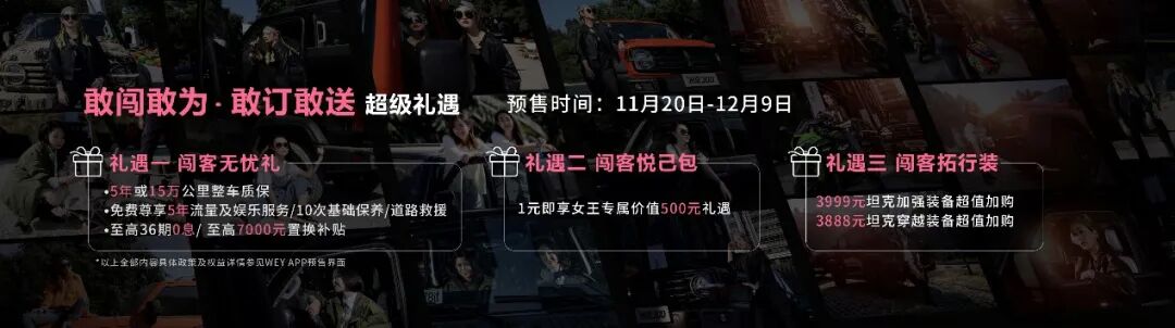 WEY 坦克300预售,包括探索者、挑战者、征服者三款车型,预售价区间为17.58-21.38万元。