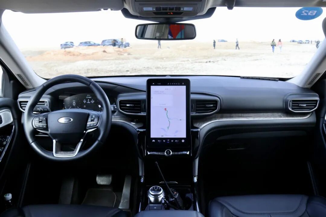 停靠在由盐堆砌的桥坝上,在四周空灵环境的映衬下,探险者的内饰更有味道了。粗犷的布局和用料,加上12.3寸的仪表盘+12.8英寸大屏,搭载和百度联合开发的新一代产品SYNC+,美式肌肉感和科技感立显。