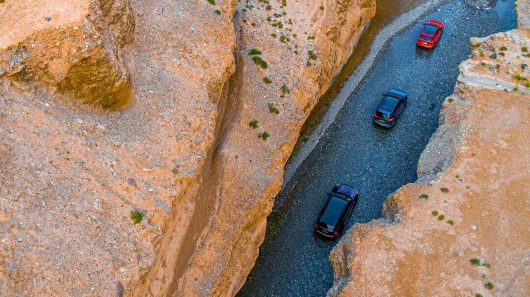 行进至大片红色河床时,可以看见沟壑纵横、洪水冲刷的印记,遍地风沙下,很容易就会迷路。据这次随队的当地导游巴特介绍,红崖也被当地人称为“大耳阔”,因高处看像个耳朵的形状而得名。大片红色覆盖之下,像极了人们向往的火星地貌。据悉,红崖也是中国火星模拟基地,不要随意破坏这里的地貌,是路途中导游一直强调的。