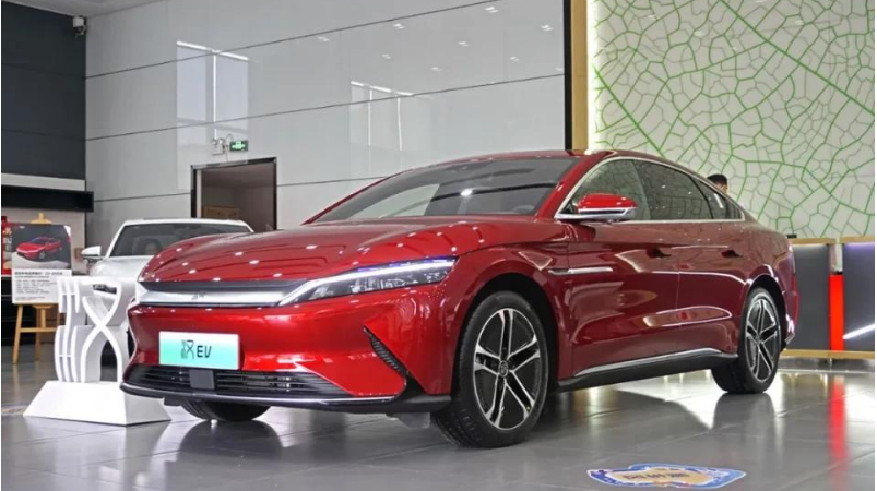 其中,汉EV使用了比亚迪家族全新的造型设计,采用了简洁明了的车身线条,整体看上去优雅大气。