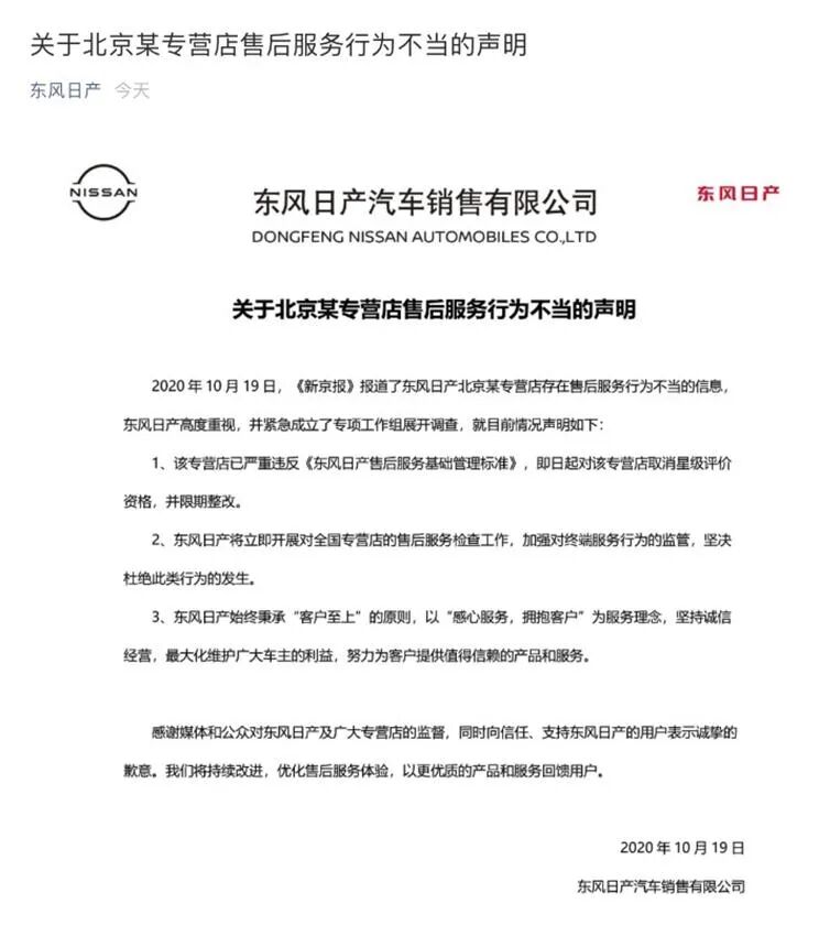 汽车事件四:东风日产:某专营店售后行为不当声明