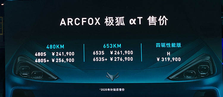 新车共推出包括480S、480S+、653S、653S+以及H在内的5款车型,其中,按照驱动形式及动力输出水平,可分为两驱版和四驱版,按照NEDC综合工况续航里程则共有480公里、653公里和600公里三个版本可选。随后,几位车主公布了ARCFOX αT的售价——补贴后24.19——31.99万元。