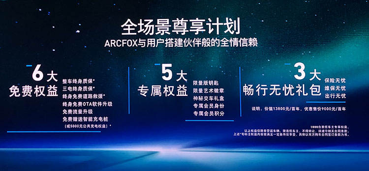 此外,发布会现场官方还公布了关于ARCFOX αT车主的“尊享计划”,车主可以享受免费权益、专属权益、无忧礼包等优惠政策,同时,购车还能享受金融与置换政策,具体内容见下图: