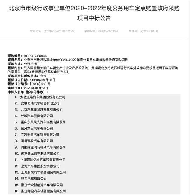 造车新势力们交付量普升也意味着造车新势力们越来越被公众所接受。据此前北京市发布的《北京市市级行政事业单位2020-2022年度公务车定点购置政府采购项目中标公告》显示,蔚来、爱驰、合众以及零跑等造车新势力出现在公务车供应商名单中。