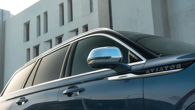 与同级别其他车型不同,飞行家侧面的线条非常修长,并且还使用了高腰线与悬浮式车顶的设计,营造出动感的姿态,甚至还带有几分旅行车的味道。巨大的22英寸多条辐轮毂也很有美式特色,也车子搭配非常协调。和其它林肯高端车型相同,飞行家也使用了电子门把手,并配有电吸门功能。