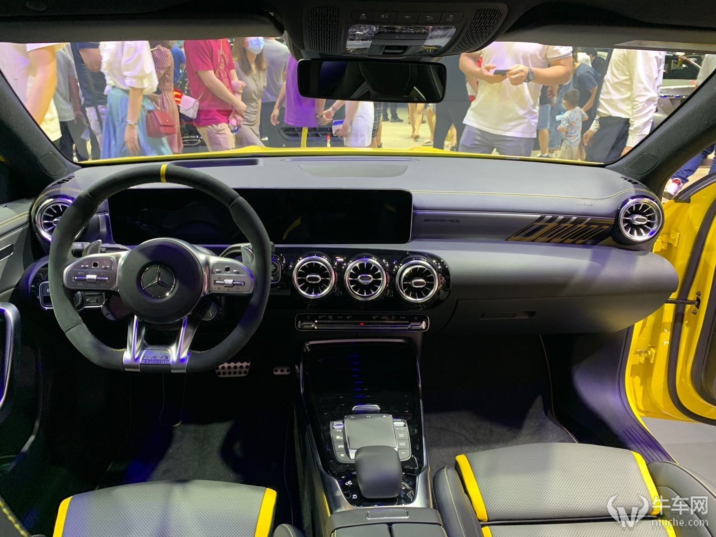 相较于外观,车内还是通过一些小细节来凸显出与普通版的不同,比如由带有黄色元素的一体式座椅、带12点黄色标记的AMG Performance方向盘、AMG方向盘按钮,显得更加战斗。车机系统则是最新的MBUX,两块屏幕组合起来加上动感的UI设计显得更为酷炫。