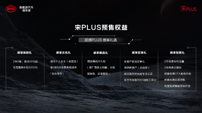 即将于九月上市的宋PLUS,是比亚迪继汉之后于今年推出的第二款重磅车型。作为一款B级SUV车型,TA填补了宋Pro(参数|询价)与唐之间的车型空白,凭借其越级品质直击中高端SUV市场。新车以充满高级感的全新设计,更具质感的越级驾乘体验,满足了消费者更加多元化的用车升级需求。而11.88万元-14.68万元的预售价格,将成为15万级SUV价值首选。即日起到比亚迪各销售服务店预订,即可享受“2年0息,首付30%起、至高置换补贴5000元”等感享五重好礼。