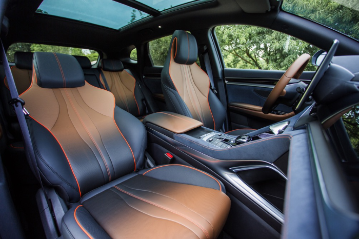 宋PLUS还是首款采用全新渐变内饰的量产车,一体式呈现墨浸棕与玄武黑的自然渐变过渡,形成创新且极具独特性的专属品牌色彩ICON。搭配进口麂皮等高档材质应用,以及细腻双缝线等高档精致做工处理,整体触感更佳,媲美豪华品牌的高级感“货真价实”。