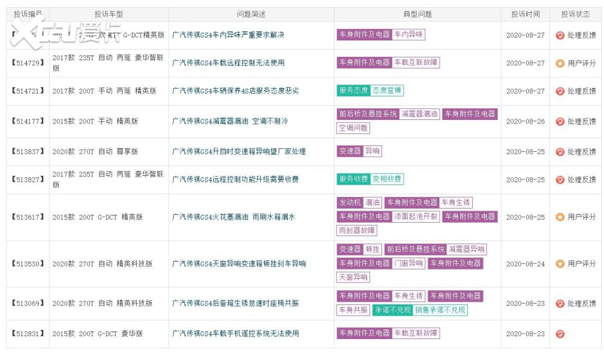 雪上加霜的是,通过车主反馈,在售传祺GS4在质量上也存在着较多的问题。诸如变速箱顿挫及抖动、发动机故障灯亮及排气故障、仪表故障、影音系统故障等问题,都出现在这款车型上。