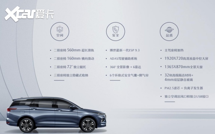 凯捷的长宽高分别为4875/1880/1700mm,轴距达到2800mm,是标准的家用MPV尺寸。内部采用了2+2+2三排6座的座椅布局,一、二排座椅可180°向后全平放倒,增加不少可灵活使用的面积;第二排座椅带有同级最大72°开角腿托,并搭配了磁浮式四向滑轨,前后滑动距离长达560mm,为第二排乘客带来双腿可完全伸直的体验,长途旅程乘坐更舒适。此外,新车的第三排座椅可独立放倒,并收纳至与地板完全平齐,后备箱容积最大可达1514L,装运大件物品更加方便。