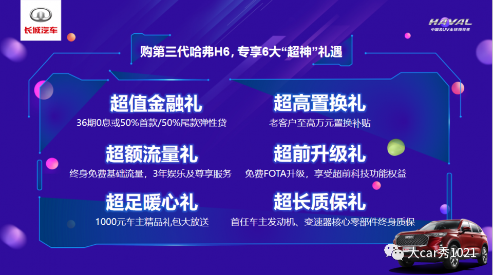 大咖驾到,服务至上 与用户达成情感共鸣如果说借势当红顶流、创新发布形式,使第三代哈弗H6冠军神车、年轻、智能的形象更加深入人心,那么,不按套路出牌,发布会内容上的大胆创意,则让第三代哈弗H6成为了行业热议的爆点话题。主持人与经销商领导、媒体、客户代表共话哈弗H6的前世今生,累计87个月销量冠军、9年销量突破300万、连续5年全球年度SUV销量TOP10、连续5年客户满意度第一……多年来,“国民神车”哈弗H6凭借强大的产品实力造就了神车传奇。神车福利,用户为王 满满诚意引发热捧打破合资不合理溢价,实打实的售价,让众媒体及众网友纷纷为第三代哈弗 H6 点赞,而6大“超神”礼遇金融政策的推出,则让用户进一步感受了“国货之光”第三代哈弗 H6 的满满诚意。6大“超神”礼遇金融政策包括:超值金融礼,36期0息或50%首款/50%尾款弹性贷;超高置换礼,老客户至高万元置换补贴;超额流量礼,终身免费基础流量,3年娱乐及尊享服务;超前升级礼,免费FOTA升级,享受超前科技功能权益;超足暖心礼,1000元车主精品礼包大放送;超长质保礼,首任车主发动机、变速器核心零部件终身质保。敢于突破与变革才能创造神话,承袭神车基因的第三代哈弗H6代表了中国SUV最高品质。得益于中国自研的首个全球化智能整车平台,第三代哈弗H6不仅将以中国质感挑战德系品质,引领智能SUV新时代,更将进一步开辟海外市场,开启从自主突围时代向全球崛起时代的升阶之路,成为全世界消费者信赖的全球神车!