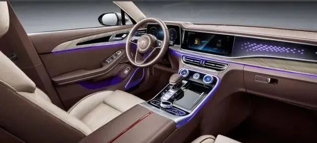 全舱环绕的中轴布局、高品质液晶仪表、中控横屏与集成红旗LOGO元素的横展饰板自成一体、环抱式点亮+前后贯通式映射,独有的东方哲学,大气雅贵。